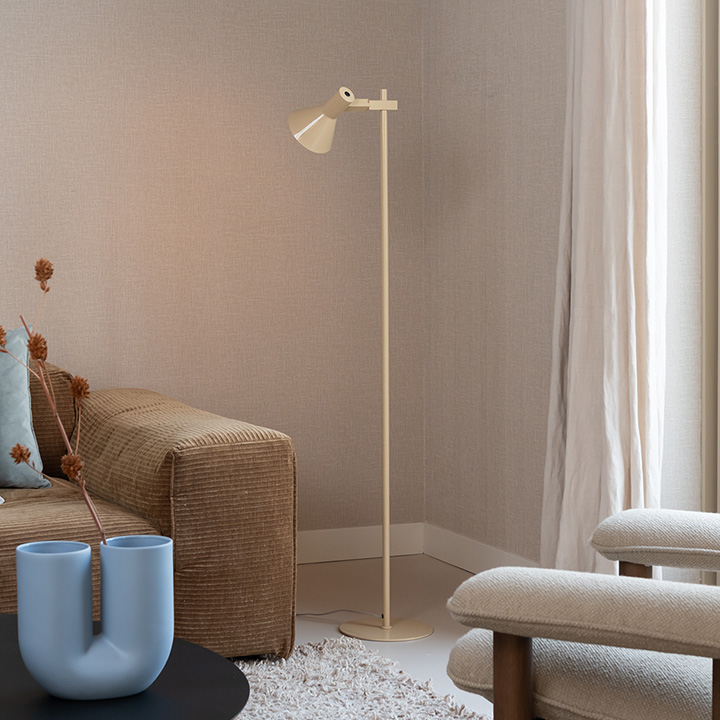 Vloerlamp Stavanger van its about RoMi is een stijlvolle en praktische toevoeging aan elk interieur. Met zijn slanke ontwerp en draaibare kap biedt deze lamp gericht licht waar je het nodig hebt. Perfect naast een fauteuil als sfeervolle staande lamp in de woonkamer.